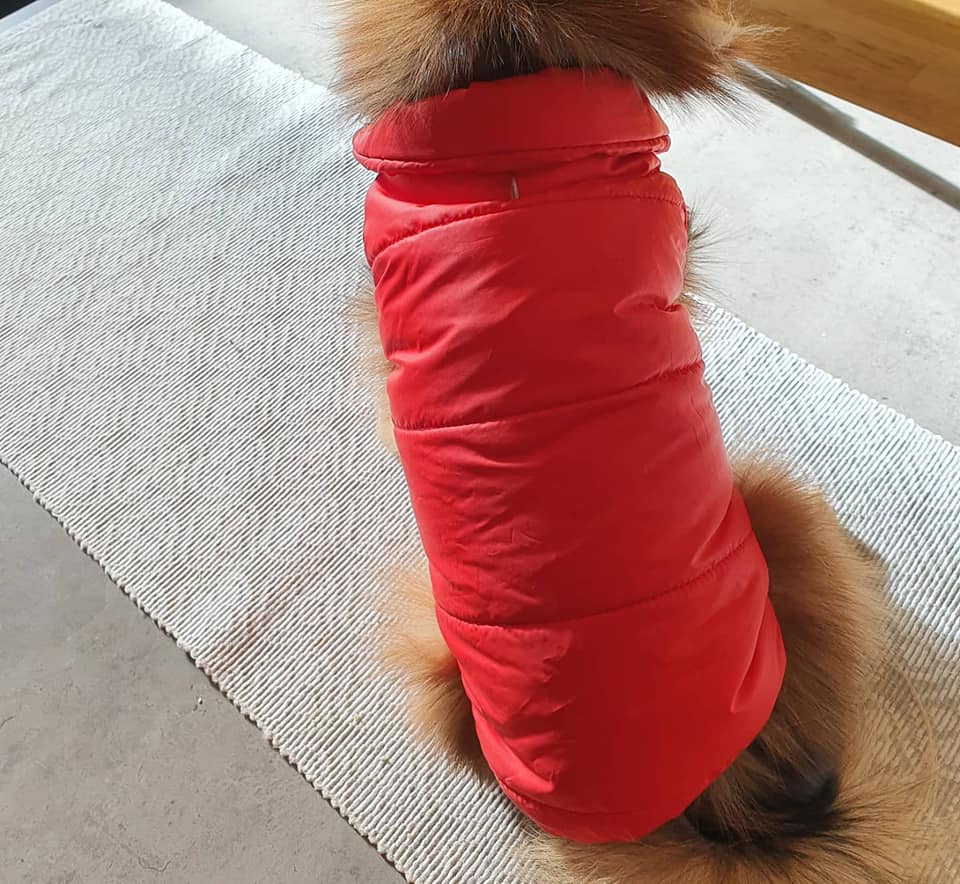 Vinterklädesdesign med en varm krage, ett koppelhål i nacken, har också elastiska kanter på fot och botten för att justera storleken efter ditt husdjur.